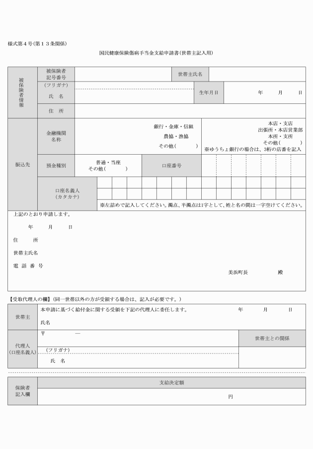 第13条 傷病手当金の支給を受けようとするときは、国民健康保険傷病手当金支給申請書(様式第4号)により、町長に申請しなければならない。